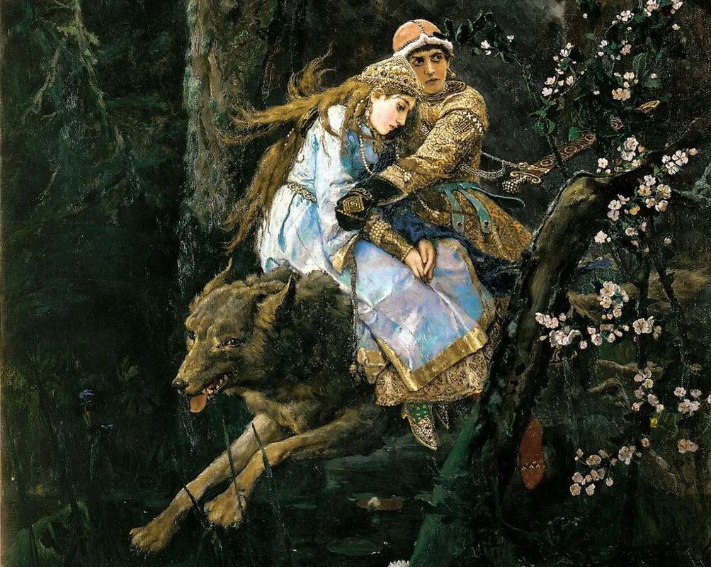 — Знаю, волчара, не сбивай дыхание, возможна погоня, — Иван, сидя верхом на волке, обнимал красавицу, предчувствуя радость брачной ночи.
