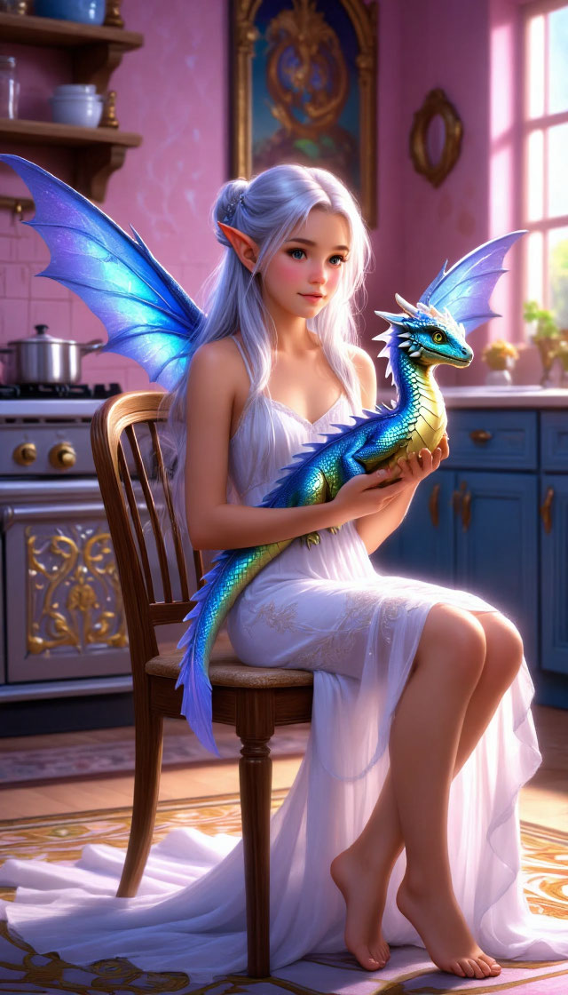 Она осторожно взяла дракончика на руки, стараясь не раздавить его. Он был тёплым и немного скользким. Эльфина отнесла его к столу и принялась аккуратно очищать его от прилипших зерен. Дракончик тихонько пищал, но не сопротивлялся. Когда он был более-менее чистым, фея налила в блюдце немного молока и поднесла к его мордочке. Дракончик жадно начал пить молоко, урча от удовольствия.