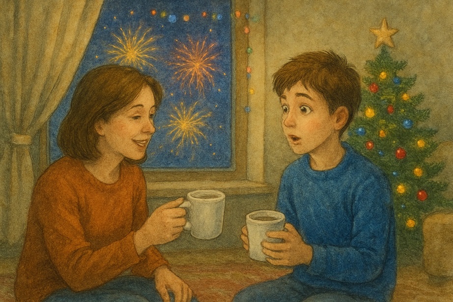 Тимур вздрогнул и обнаружил себя на полу в своей комнате. За окном били куранты, салют рисовал разноцветные узоры на стекле. Дверь открылась, и вошла мама. Взрослая. В её руках были две кружки с горячим чаем.