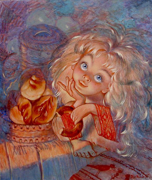 Под кроватью лежит кошка, она чуть пододвигается, и сначала проявляются круглые глаза домового, потом он сам, весь, в голубоватом цвете. Филька лежит головой на кошке, грызет сушку. Видно небольшое личико, курносое, добродушное, с круглыми глазами и большими, толстыми губами.