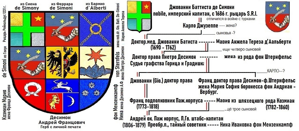 Первый наш российский предок - Франц в 1796 г. был принят в Российскую службу поручиком во время 2-ой российско-австрийско-турецкой войны с фамилией Десимон. Такая фамилия существовала в графстве Горица и Градишка с 1750-х г.[11], а, возможно, и раньше. Основателем её являлся доктор права Пиетро Десимон, судья[12] . Его сыновья Джованни, а также Франц (1766–1845), которого в разное время писали Франческо, оба доктора права[13] . Но что интересно, сын последнего — Мориц одно время упоминался в исторических документах как Десимони и даже совершенно несуразно - фон Десимон[14], но впоследствии вернулся к приобретенному отцом в Священной римской империи имени Десимон фон Штернфельс (с присоединением фамилии матери его отца), а сын Джованни — Франц (1773–1818) стал в России Францем Егоровичем Дессимоном. Время приспосабливало фамилию к обстоятельствам порой непростой жизни, то сокращая её, то разукрашивая другими дополнениями. Так было.Строго говоря, фамилия Десимон — некоторое сокращение, вольное и произвольное преобразование от родового имени — де Симони, путём присоединения приставки «де» (из) к имени и лишения фамилии окончания «и» (указывающего на множественное число, с буквальным переводом — принадлежащих к потомкам некого стародавнего родоначальника Симона).