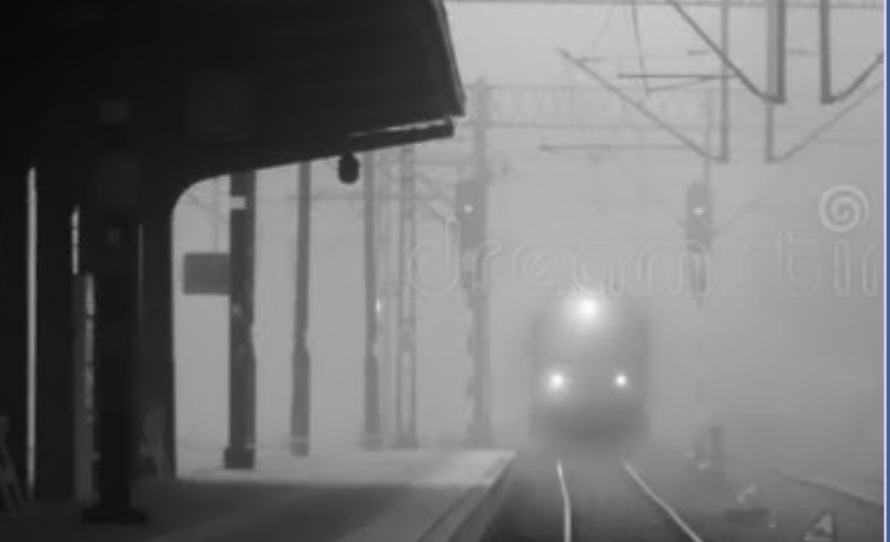 Вначале звук поезда, затем желтое пятно прожектора, за которым невнятный силуэт локомотива обретает четкие очертания.