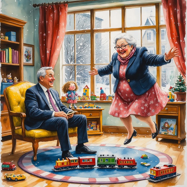 В холле, отложив свой кожаный портфель, на коленях ползал сам министр транспорта, Василий Петрович. И не просто ползал, а с сосредоточенным видом строил огромную железную дорогу! Он неловко двинулся назад и наступил на тот самый портфель. Замок щелкнул, и на пол посыпались папки с грифом “Совершенно секретно”. Василий Петрович с легким раздражением отодвинул их носком ботинка, освобождая путь для рельсов.