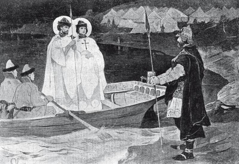 "...Когда же начало всходить солнце, он услышал шум сильный на море и увидел один насад, плывущий по морю, и стоящих посреди насада святых мучеников Бориса и Глеба в красных одеждах, держащих руки на плечах друг друга. Гребцы же сидели, словно мглою одетые. Произнес Борис: «Брат Глеб, вели грести, да поможем сроднику своему князю Александру». Увидев такое видение и услышав эти слова мучеников, Пелугий стоял, устрашенный, пока насад не скрылся с глаз его..."