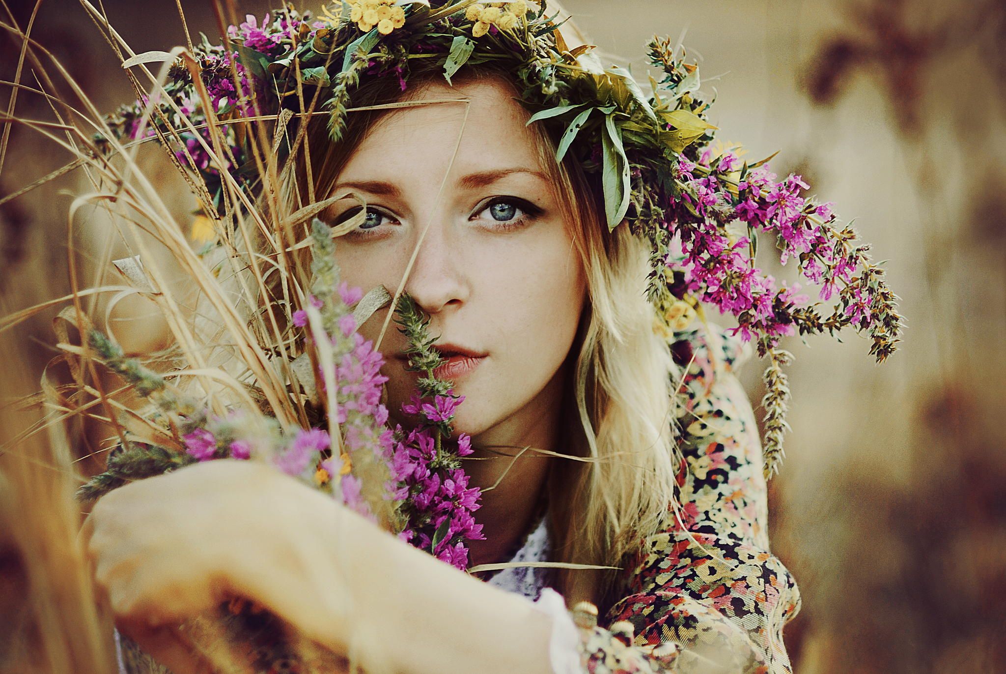 утопая в цветах на полянке