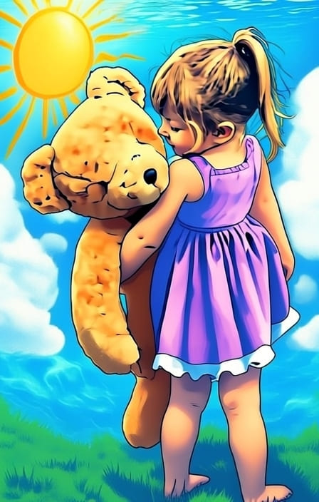 Был у Машеньки плюшевый медведь, с которым она часто играла и всегда с ним спала. Медведь этот был довольно большой, тёмно-коричневый, с немного вытянутой мордой. Но он был какой-то совсем не мягкий. Даже немного страшноватый. Но такой родной и любимый. Когда его носили, то лапы у медведя смешно болтались. А когда его носила Машенька, то ей приходилось облокачивать на своё плечо морду мишки, обхватывать игрушку ручками за спину, при этом его лапы почти доставали до пола. Тогда малышка расставляла немного в сторону свои ноги, чтобы при ходьбе не наступить на любимца и не споткнуться. Такой способ передвижения действительно напоминал вперевалочку медведя, только шёл он, как будто спиной вперёд.