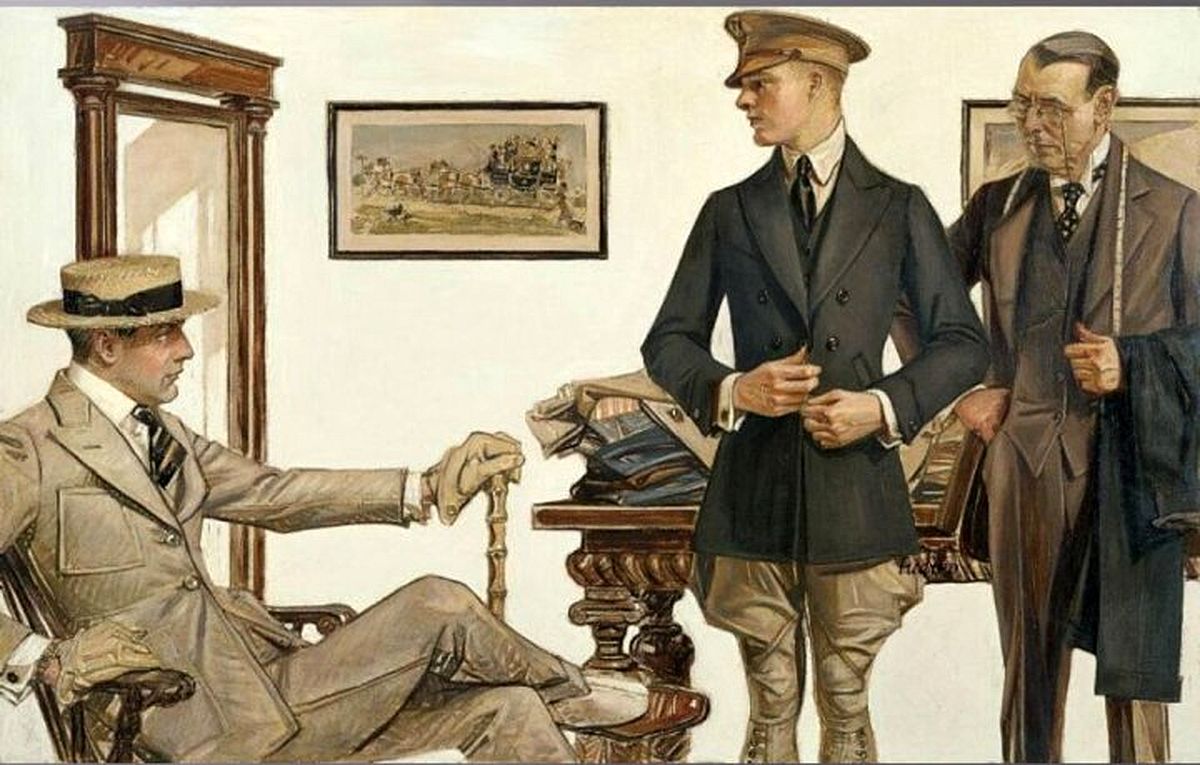 Иллюстрация: 1918. Джозеф Кристиан Лейендекер, американский художник, иллюстратор (1874-1951). «Джентльмены». Примерно так проходила экипировка Максима Исаева с участием заведующего секретно-оперативным отделом Московской ЧК С.А. Мессинга и портного-костюмера ВЧК Петра Фёдоровича Иванова.