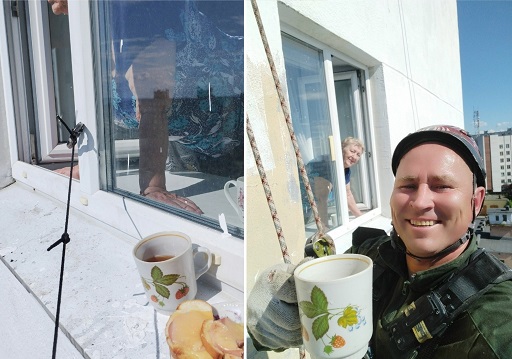 - Есть специальный крепеж для бутылок с водой, иногда люди берут рюкзачки, чтобы с собой что-то взять. Кроме того, есть подсобник внизу, который может что-то зацепить, поднять. Еще есть так называемые "добрые окна", когда люди нас поят, кормят через свое окно. И воду предлагают, и плюшки, и до борща дело доходило. Но в основном, конечно, слезаем со стены, нормально обедаем, и снова вывешиваемся. Перед завесом стараемся сходить в туалет, а иначе опять же придется спускаться и бежать. Если у человека какое-то расстройство желудка, может дойти и до того, чтоб оставить его работать внизу подсобником.