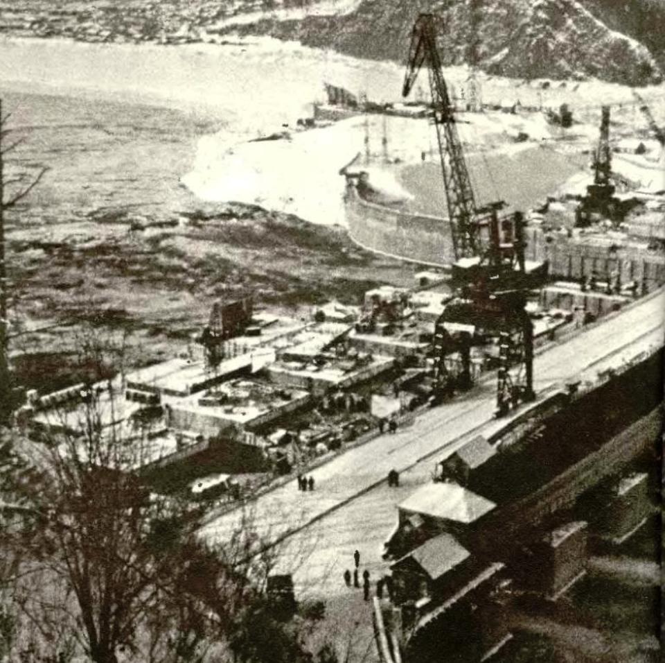 В ночь с 18 на 19 июня 1959 г. у Братска в районе строительства Братской ГЭС перекрыта плотиной непокорная река Ангара. На фото строительство – зима 1959 г.