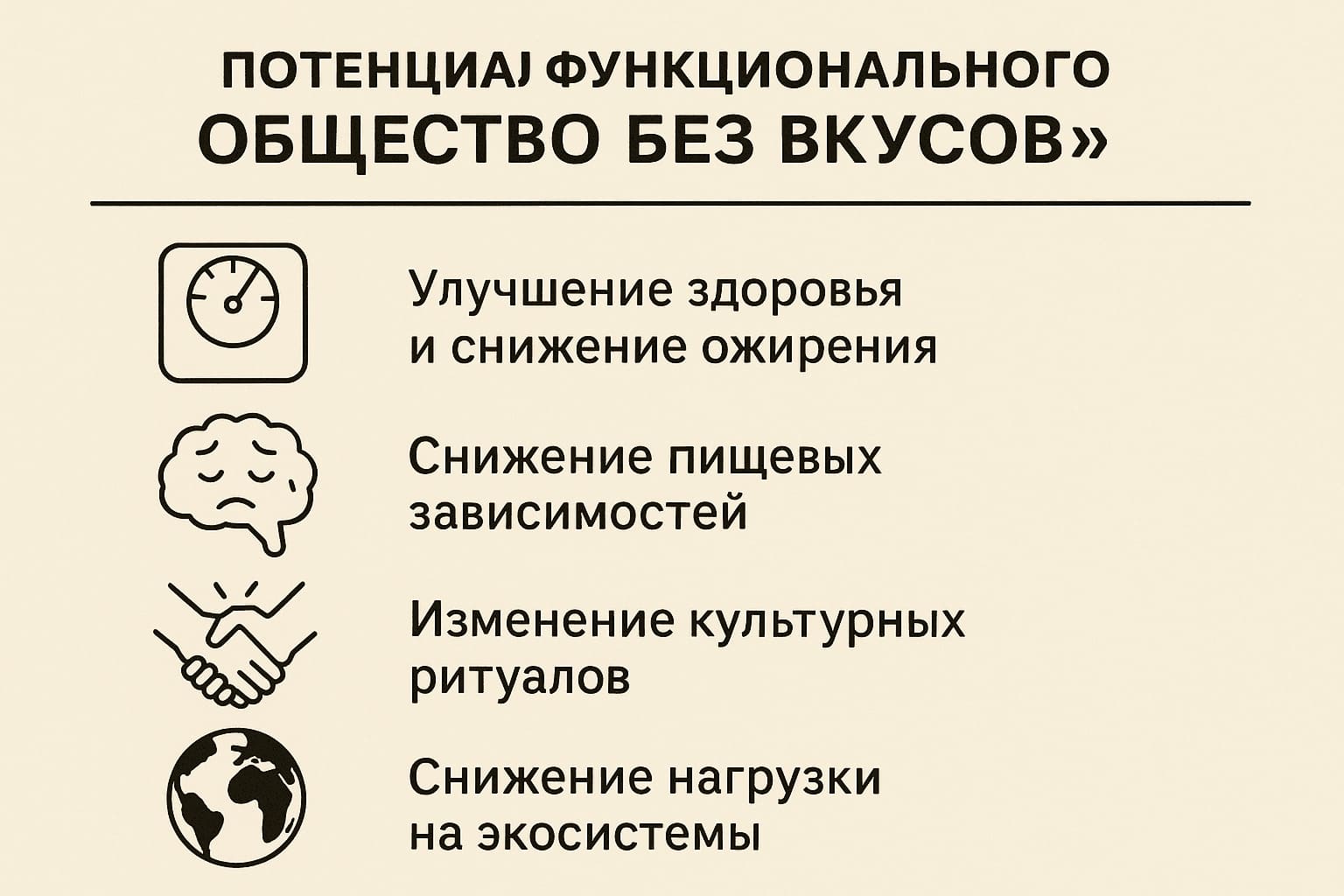 Современное человечество переживает глобальный кризис питания: пищевое поведение всё больше определяется эмоциональными, культурными и маркетинговыми факторами, а не физиологическими потребностями. В данной работе предлагается модель функционального питания «Общество без вкусов» (ОБВ), в которой еда рассматривается как топливо, рассчитанное исключительно на поддержание организма, а вкусовое удовольствие сведено к минимуму. Модель анализируется в пяти измерениях: биологическом, психологическом, социальном, экономическом и экологическом. Проведена системная реконструкция возможных последствий внедрения ОБВ, включая улучшение здоровья населения, снижение потребления ресурсов, сокращение пищевых зависимостей, изменение культурных ритуалов и потенциальные риски государственного контроля. Представлен теоретический дизайн эксперимента для эмпирической проверки модели. Делается вывод, что ОБВ является жизнеспособной концепцией, способной радикально изменить жизненный уклад человечества, при условии сопровождения культурной и смысловой трансформацией.