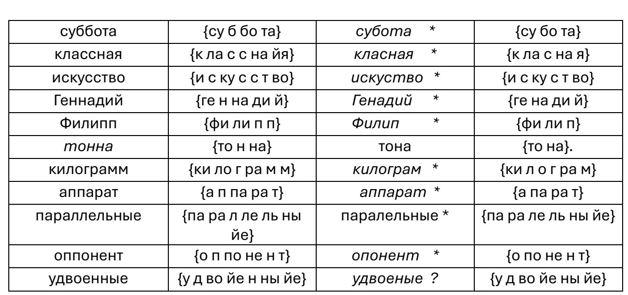 И каким образом в нашэй импровизированой - {и м п ро ви зи ро ва н но й} таблицэ, звуковой состав каждой записи одного слова совпадает с его правописанием.
