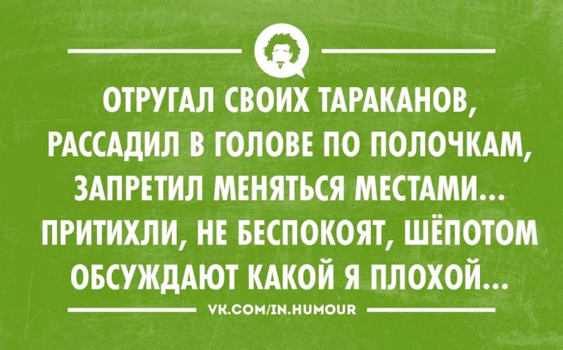 Говорят тараканы в голове есть у всех... просто у одних они дикие, а у других одомашненные. Наверное все зависит кто кого воспитывает. Они вас, или вы их))) мир несправедлив! У одних бабочки в животе, у других тараканы в голове... а у жителей Маврикия тараканы умеют летать и они летают везде... чур меня чур.