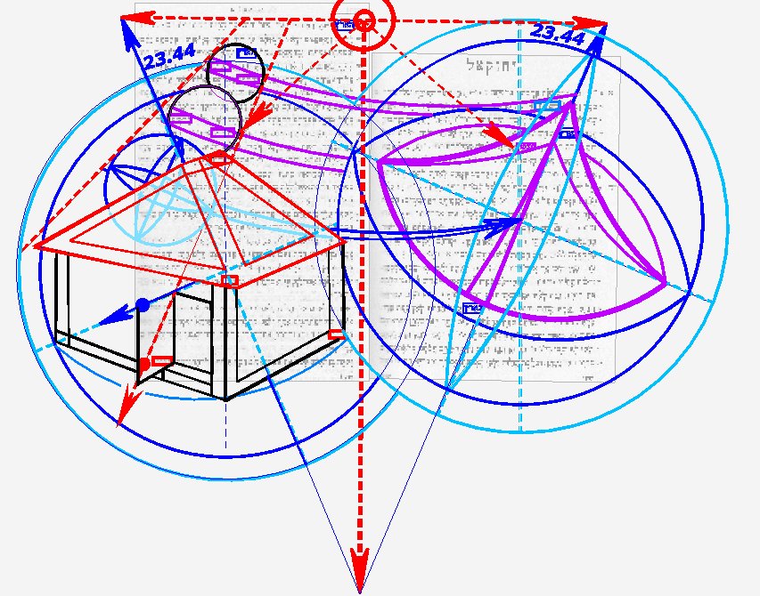 4. Уже на предыдущем чертеже предположительно Автор указал нам ВХОД в шатёр. Каким же образом образуется ВХОД В ДОМ? Прежде всего, так интерпретируется оставшееся необъясненным четвертое слово ДОМ, а угол текста, обозначенный красным кругом и означающий АВТОРСКИЙ ФОРМАТ ТЕКСТА, позволяет показать открытую ДВЕРЬ - вплоть до оси экваториальной плоскости. (Я подчеркнул ее синим кругом) Все сказанное интерпретируется следующим образом: