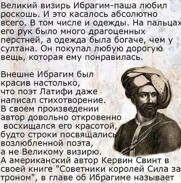 Своего рода Паганини Только живший в Османской Империи. Тяга кол всему европейскому, наверное, и привила ему любовь к музыке и игре на скрипке. Интересное сочетание Великий визирь, воин, музыкант и, как я понимаю, привлекавший внимание своих соплеменников к другой культуре.