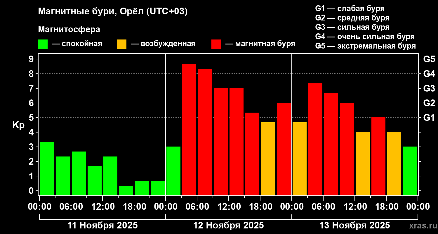Хорошо бы конечно снять показания на эфирометре, когда был максимум магнитного потока… (или как он там называется, поскольку понятие магнитный поток как-то неестественно звучит) , магнитная буря , приближавшаяся к экстремальной в 6 часов утра 12 ноября. Но не получилось отследить максимум по данным СМИ, тем более по разным данным время максимального уровня магнитной бури в разных СМИ разные: где-то ночь, а по факту - утром с 6 до 12 часов. И как пишут, эта буря сопровождалась полярными сияниями чуть ли не до средних широт. У нас в Орле в это время была пасмурная дождливая погода. Никто ничего не видел.