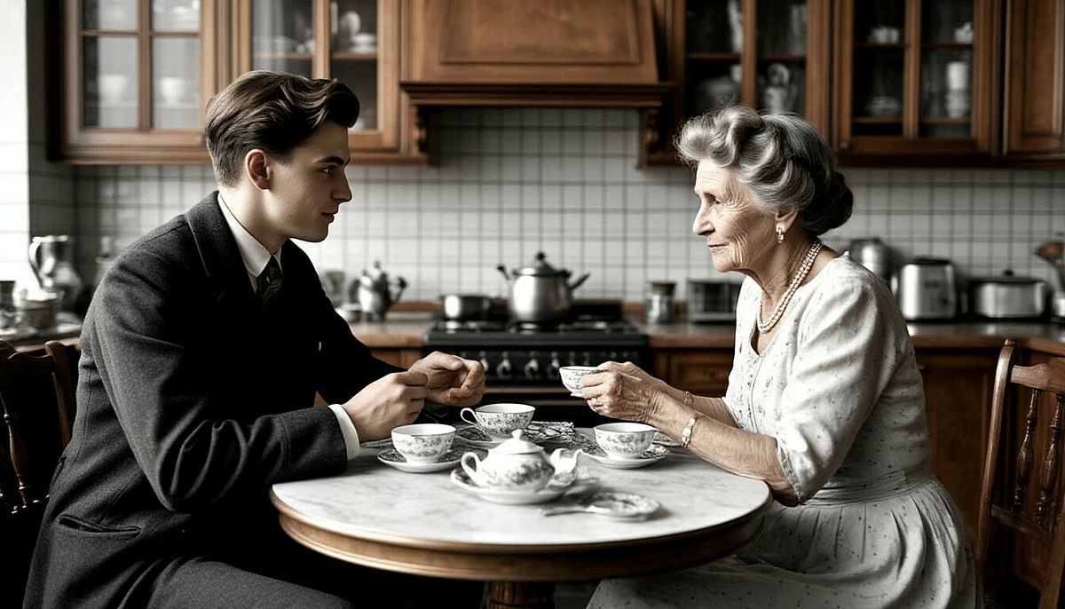 Иллюстрация: 1918. Чаепитие Максима Исаева и его квартирной хозяйки, Елены Николаевны, на кухне в квартире элитного дома в Москве. Картинка сгенерирована нейросетью YandexART по заданию автора книги.