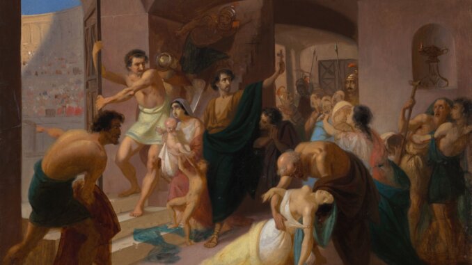 Сюжет картины рассказывает о гонениях на ранних последователей христианства в Римской империи. Особой жестокостью было отмечено время правления императора Нерона (54—68 годы нашей эры). Но не только его. Существует предание, что на арене Колизея, вмещавшей до 87 тысяч зрителей, христиан отдавали на растерзание диким зверям. Римский Колизей, кстати, построили примерно в 72—80 годах. А кровавое развлечение римлян обычно связывают с временами императора Траяна (98—117 годы).