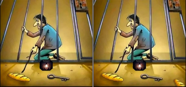 Из недр интернета показалась картинка (слева на иллюстрации). Картинку мы взяли, и начали разбираться, что же на ней изображено. Человек тянется тростинкой к батону через прутья клетки. Он хочет батон подцепить и подтянуть к себе. Картинка же, по всей своей логике, намекает, что нужно тянуться к ключу? Видимо, так. Вот замок на сквозной двери клетки, вот ключ, тянись, мол, ко ключу. Ты откроешь замок, и сможешь взять батон, войдя в клетку. Так на оригинальной картинке-рисунке. Справа картинка доработана, внесен дополнительный элемент, т.е. еще батон, который, возможно, достать, не открывая дверь, будет сложнее. И раз есть этот дополнительный батон на второй не оригинальной картинке, то возможно есть и третий, который не видно, потому что этот второй показан не полностью, он, таким образом, «намекает» на вероятное присутствие в клетке еще батонов, которых не видно на рисунке.