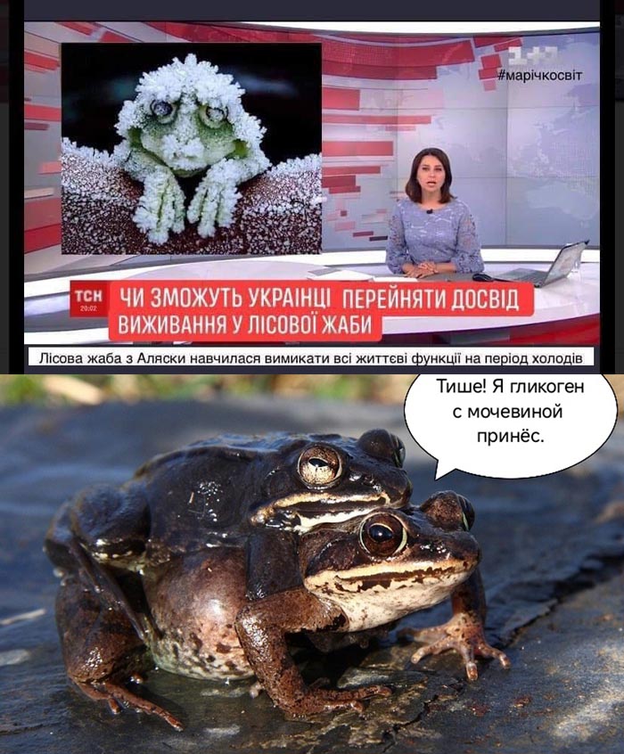 Несчастных украинцев уподобили лягушкам. После того, как ВКС России уничтожили украинские электростанции и в домах великоукров исчезли тепло и свет. Теперь СМИ готовят их к участи Аляскинской лесной лягушки. Её особенность в том, что пока все нормальные земноводные спят под водой, эта вмерзает в лёд, становясь ледышкой на 65%. От смерти её спасают мочевина в мышцах и гликоген в печени, накопленные заранее. Просыпается отмороженная до того, как с озёр и рек сойдёт лёд и с потоками талой воды скатывается во временные озёра, чтобы заделать головастиков. Там у них нет внешних врагов и лягушата растут быстро и безопасно. Вопрос: много ли украинцев согласны леденеть за родину?
