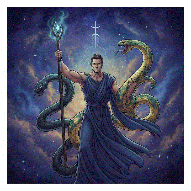 Змееносец (Ophiuchus) — загадочное созвездие, пересекающее эклиптику и называемое "13-м знаком зодиака", хотя традиционная астрология игнорирует его ради 12-знаковой системы. Это архетип трансформации: целитель, борющийся со смертью, но рискующей гибелью за баланс. В вавилонской астрономии — "Стоящие боги", стражи хаоса. Греки воплотили в нём Асклепия, сына Аполлона, обученного Хироном искусству медицины. Асклепий воскрешал мёртвых змеиным ядом (символ яд=лекарство), за что Зевс поразил его молнией и вознёс на небо с посохом, увитым змеёй (Serpens) — эмблемой медицины.
