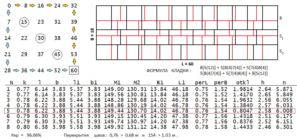 будет получена таблица, показанная в иллюстрации. Выделенная красной рамкой строка позволила найти достаточно рациональный вариант с коэффициентом использования крана Kкр = 96.06% и количеством курсов n=6. Рядом с планами смежных курсов приведена формула математической кладки.
