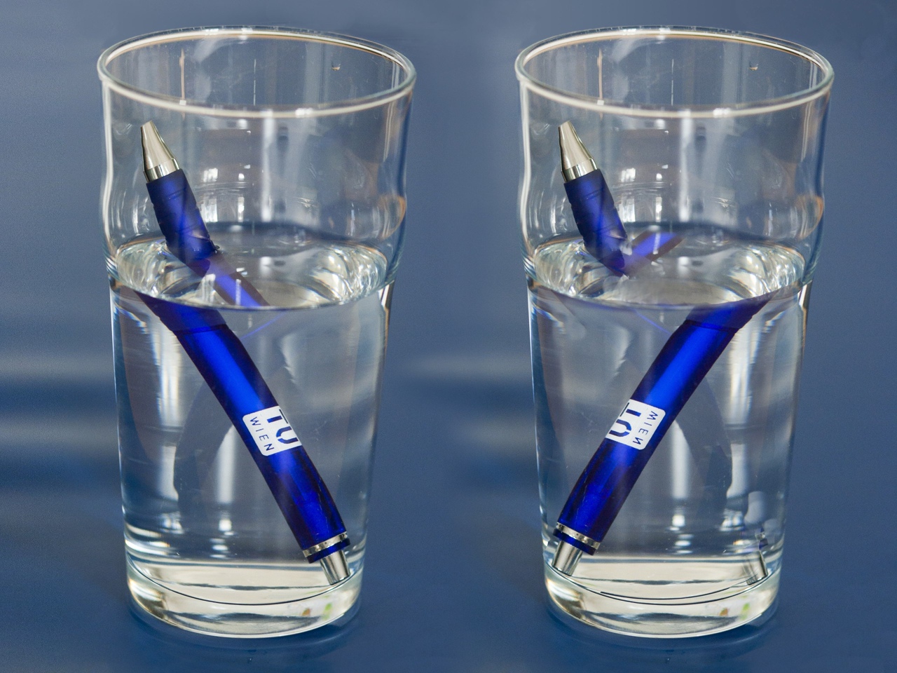 Как луч света преломляется на границе двух сред, создавая превратное представление о реальности (рефракция на иллюстрации), так и работа сознания, которое преломляется на границе субъекта и объекта познания, создаёт превратное и искажённое представление об истинной реальности.