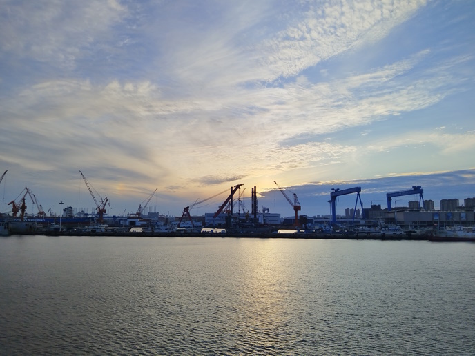 Романтика даляньского неба - в том числе и такая. Как в старые добрые Достойные (так их зову) времена - устремлённые в небесную высь подъемные краны, как символ строительства нового, символ растущих экономики и благосостояния народа. Как вечное стремление ввысь - к неизведанному и лучшему.